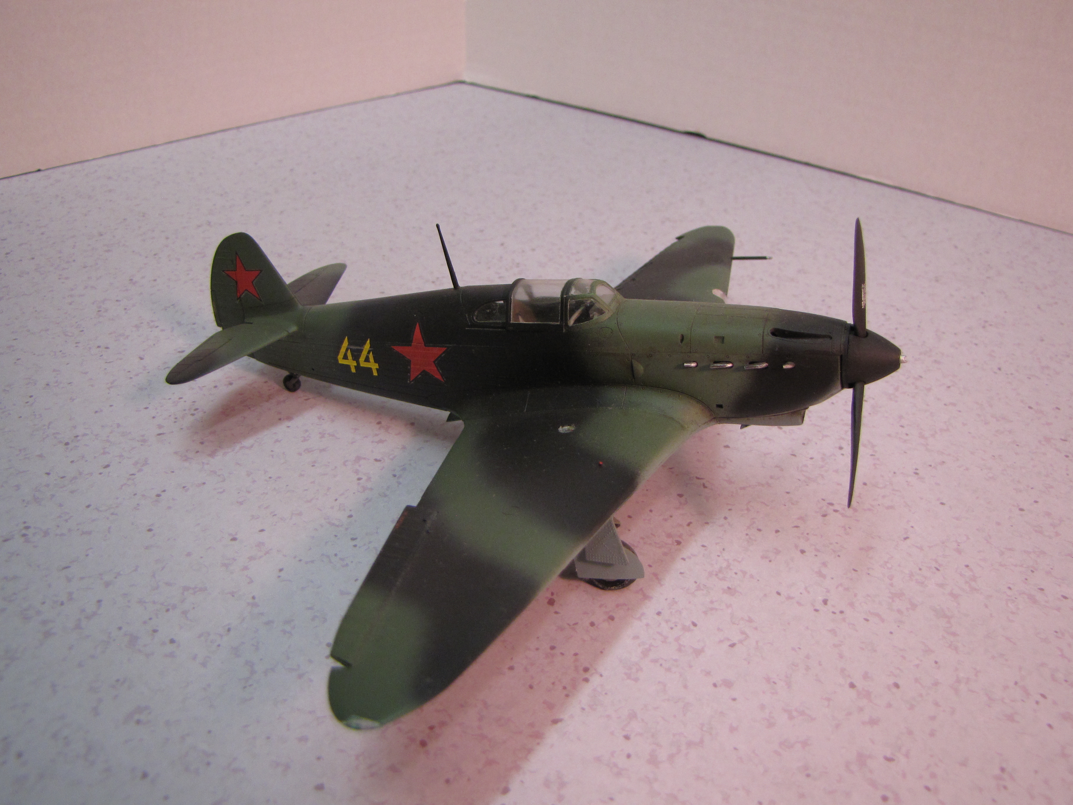 The model is an early Yak-1 from the Accurate Miniatures kit.  The Yak-1 was a part of the generation of “new” aircraft the Soviets were introducing at the very start of World War II, and it is generally considered the best of that bunch.  Overall it was about as good as a Bf 109F or Spitfire Mk V.  Later derivatives of this design would still be among the Soviets’ best at the end of the war.