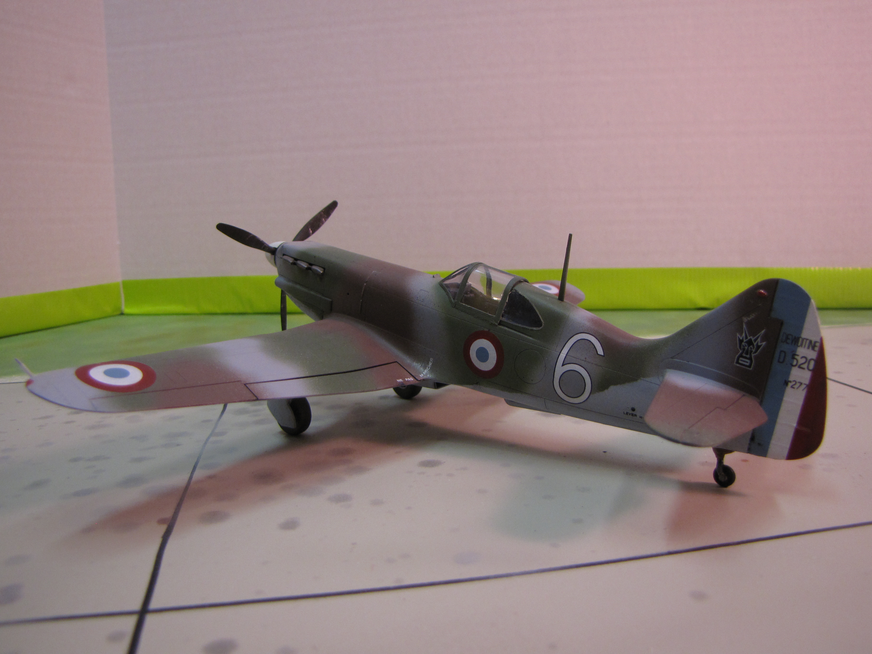 This particular subject was flown by Pierre Le Gloan in the Battle of France. His combat record matches his home country’s confused situation. He scored four kills against the Germans in the obsolete MS.406. His unit was withdrawn to Paris to re-equip with the D.520 on June 1. When Italy declared war on France his unit was re-assigned to that front. Pierre Le Gloan shot down seven Italians, including five on one mission, in the aircraft shown here. After the armistice, he flew for the Vichy government and shot down seven British aircraft. His unit was based in Algiers in November 1942 when the US and Britain invaded North Africa. The French forces in North Africa quickly switched sides, and Le Gloan found himself flying patrols against the Germans again in American supplied P-39s. He was killed in a flying accident in September of 1943, and remains the fourth ranking French ace of WWII.