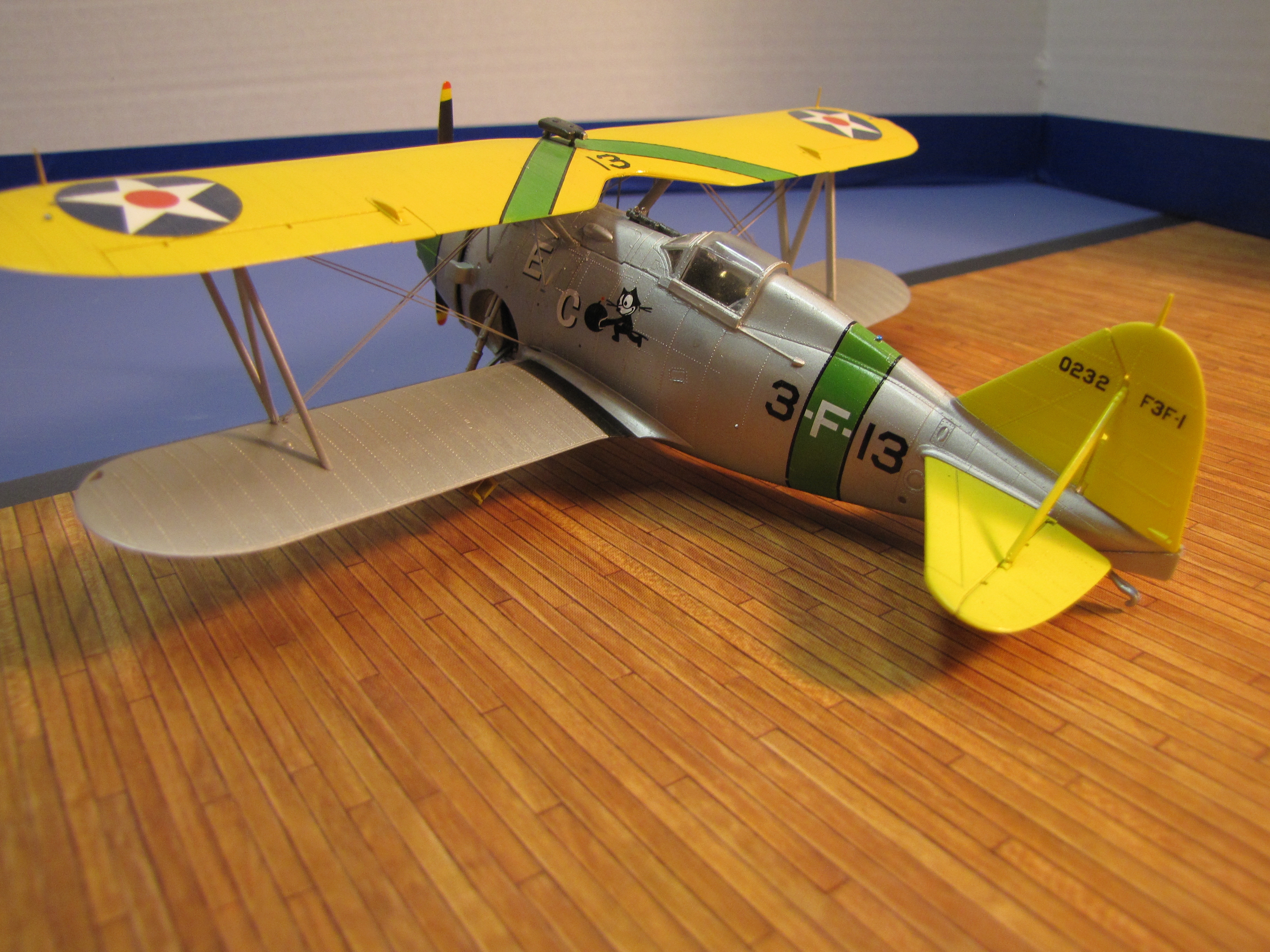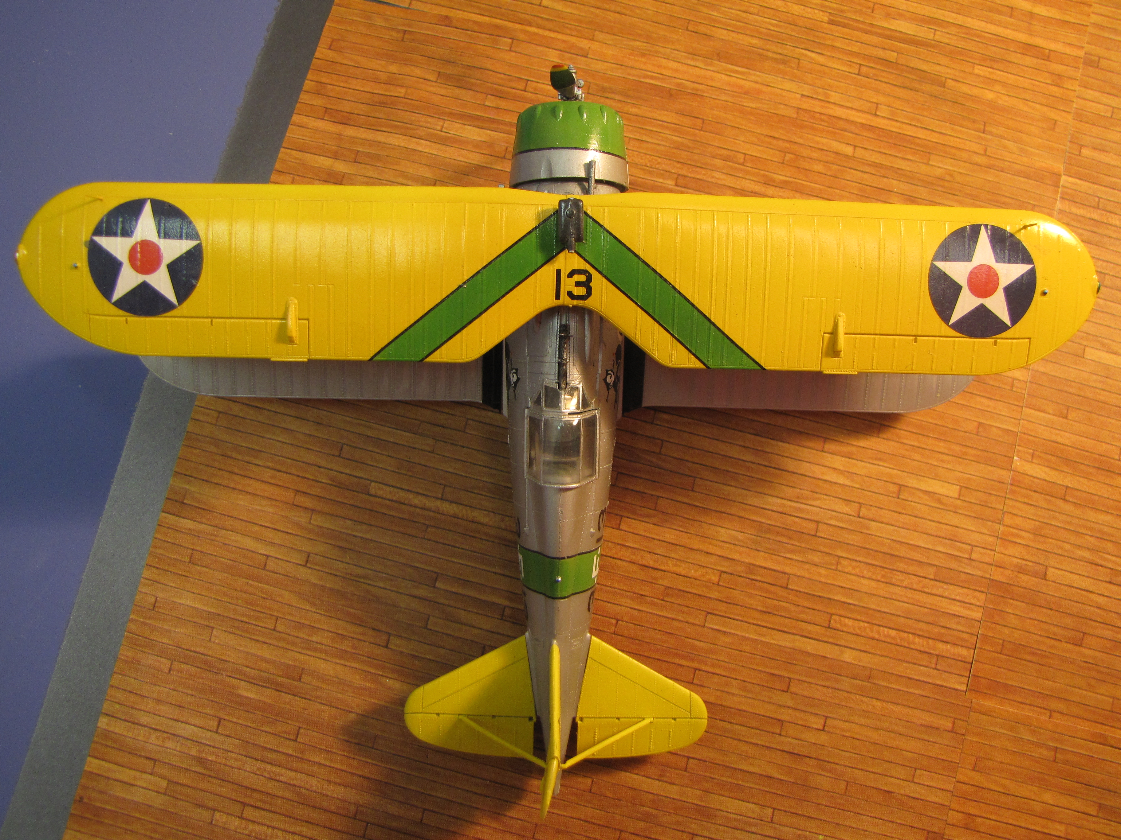 This subject is from the Accurate Miniatures kit. It was an absolute blast to build. It is shown in the Navy’s “Gold Wings” color scheme that was in use until it was replaced by “Neutrality Grey” in 1940. A fun aspect to these markings is how much they tell us about the aircraft. The Willow Green nose and fuselage stripe indicates it belongs to its squadron’s fifth section (three aircraft per section at this time). That the nose is a solid color means it belongs to the section leader, so solid green is number 13. The Lemon Yellow tail identifies the plane as being based on the Lexington. The side number is 3-F-13 which means aircraft 13 of Fighting Three. And serious Navy fanboys say “whaaat, you screwed up!” Because everyone knows Fighting Three was based on the Saratoga…