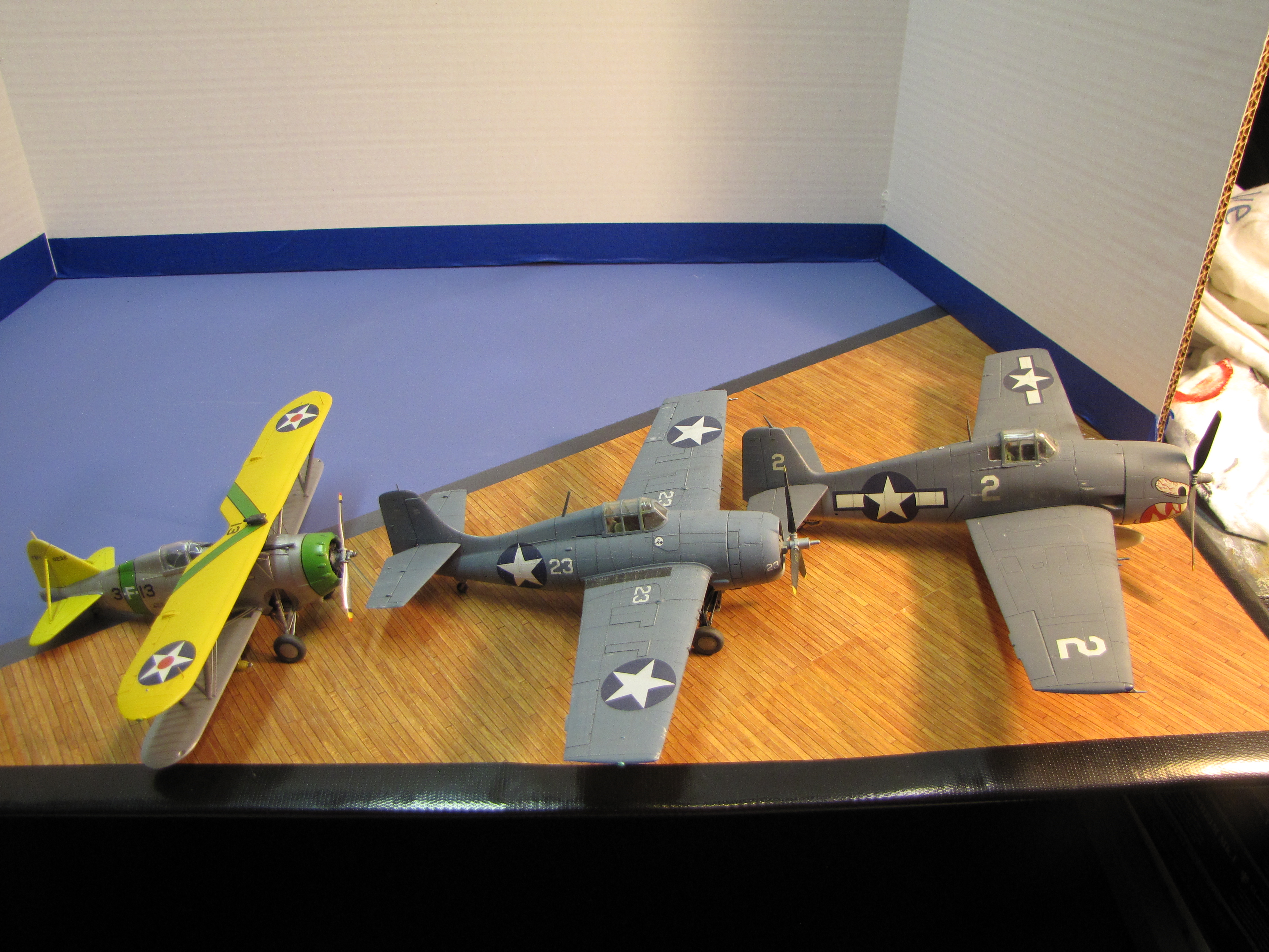 Progression of Grumman fighters. I took this picture to show the family resemblance. But I was more struck by the growth. From F3F with 700 HP to F4F with 1200 HP to F6F with 2000 HP.