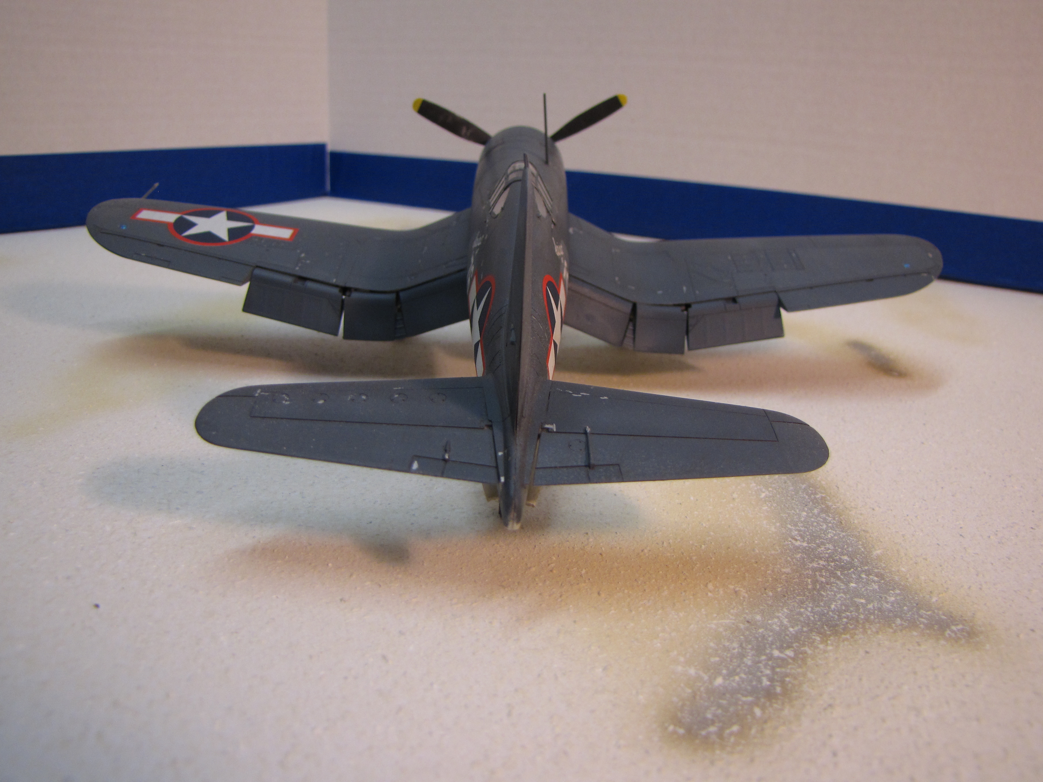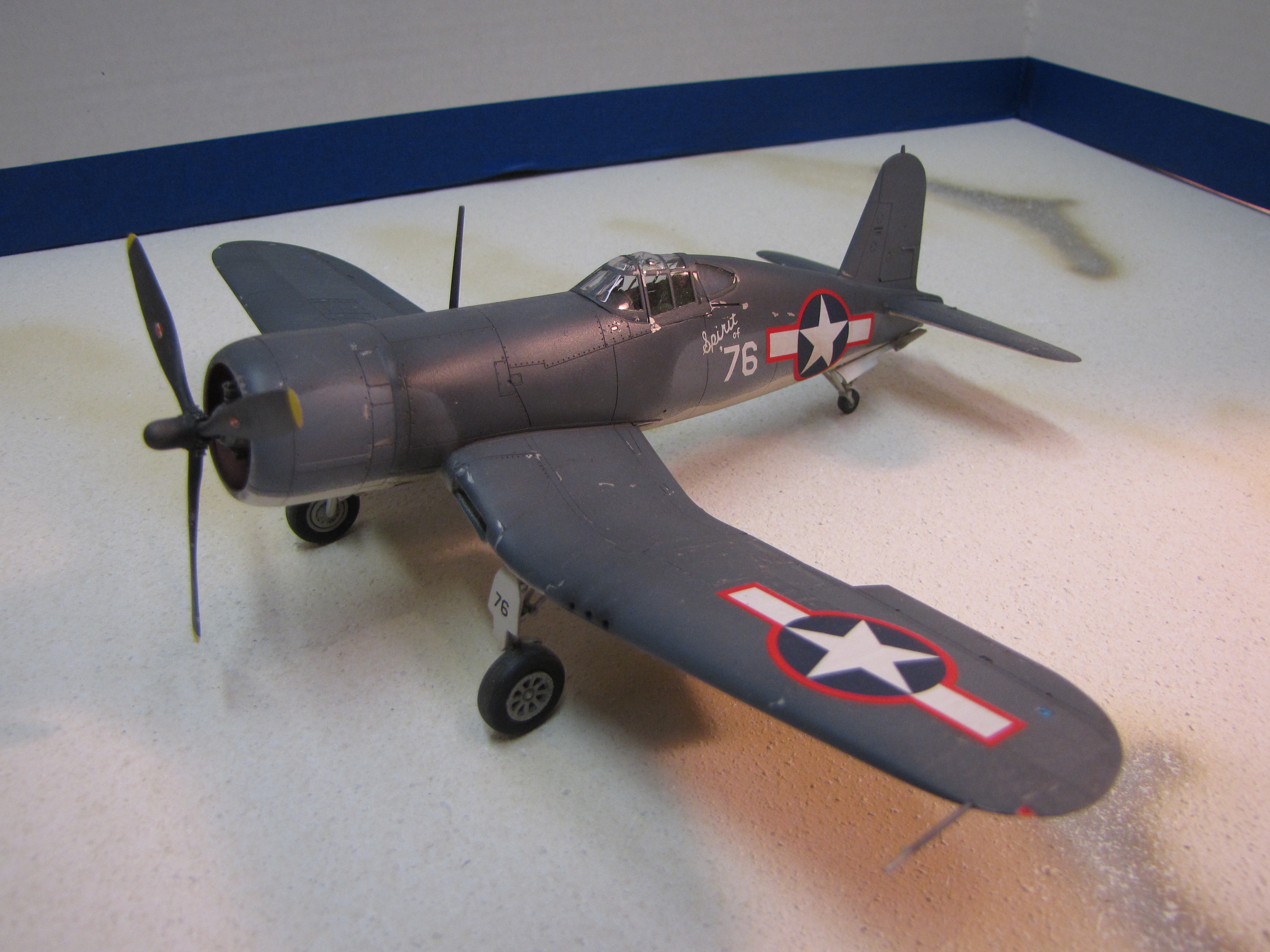 This example is the Tamiya kit with Superscale decals.  This aircraft is a late bird cage Corsair (a late early model?), and was operational with VMF-215 summer of ’43 in the Solomons.