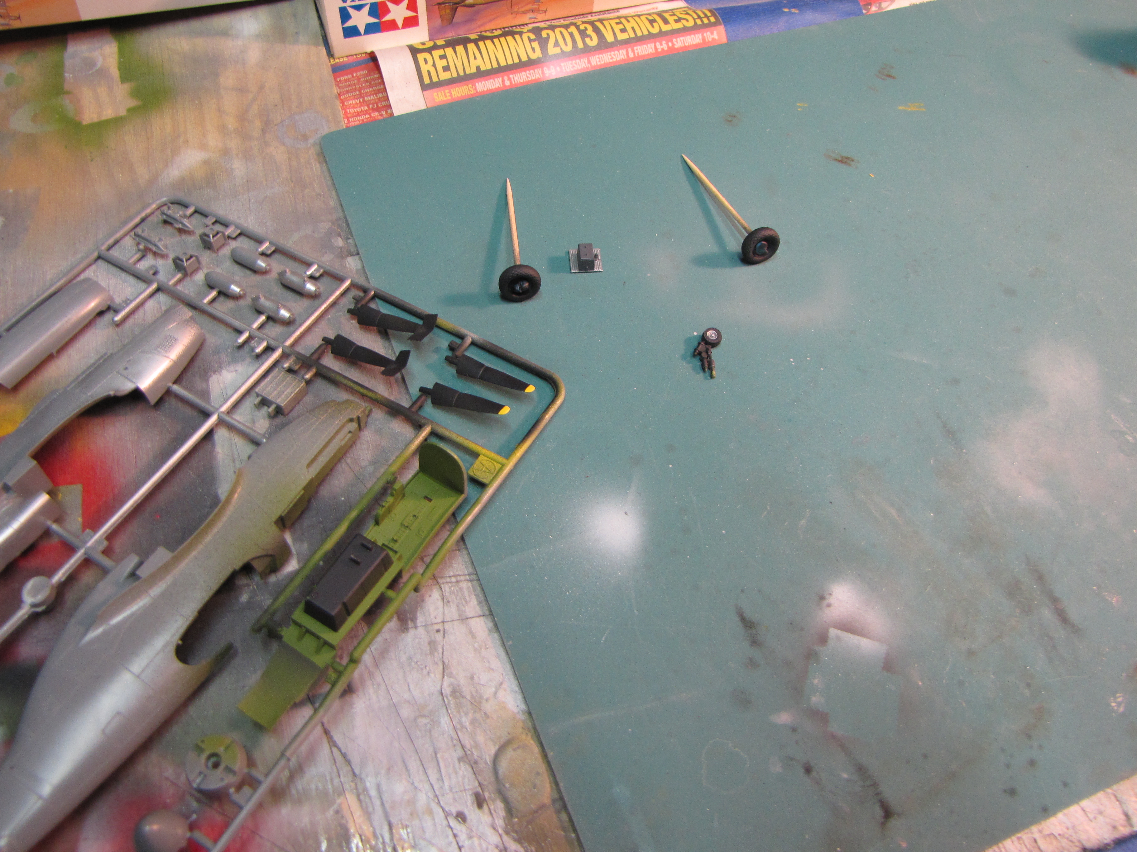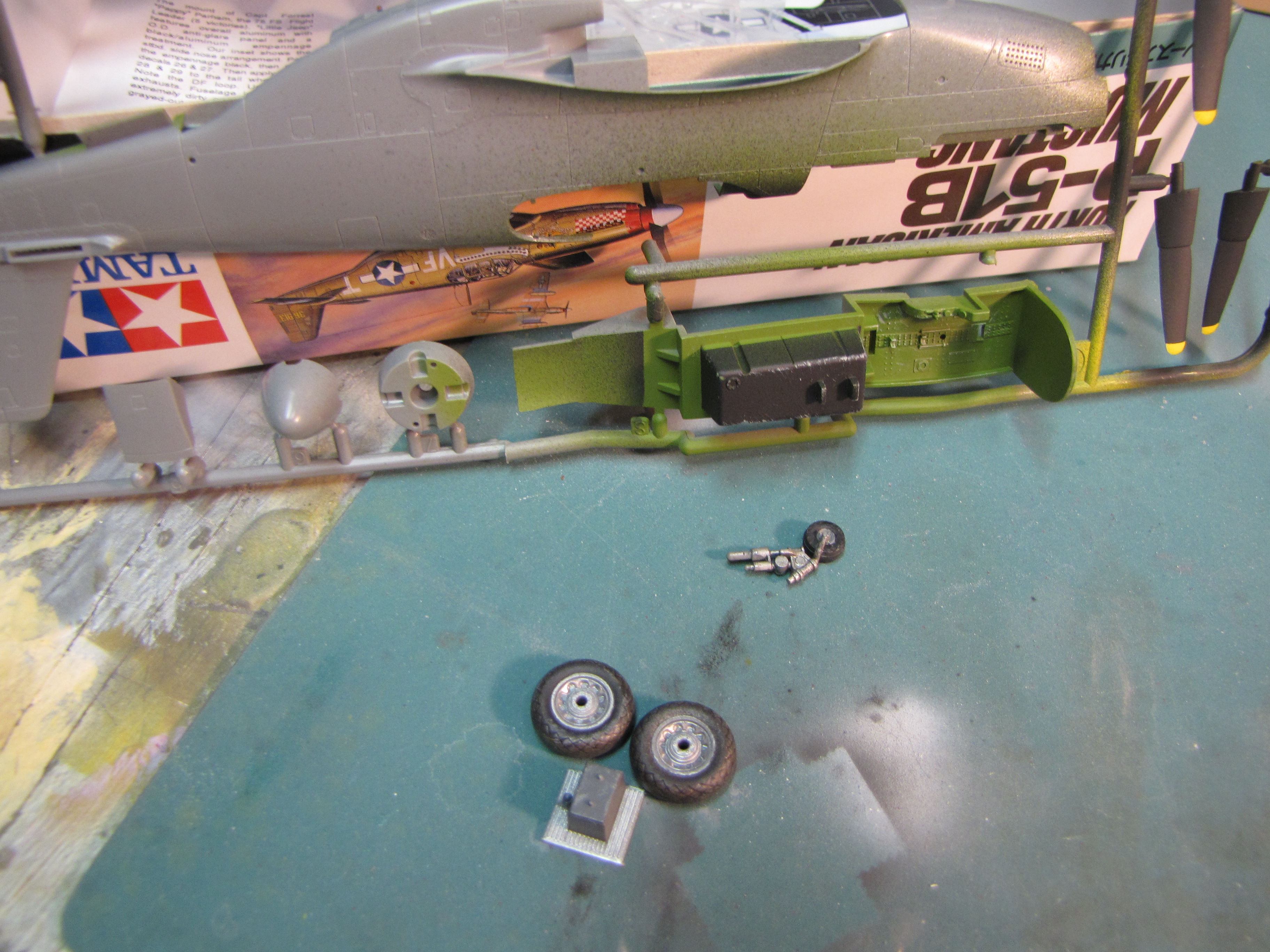 Now its time for some dry brushing. An old brush with small amounts of medium grey paint is brushed across most of the painted surfaces. The tires got the treatment with grey and brown to look like they’ve seen service at a poorly prepared airfield.