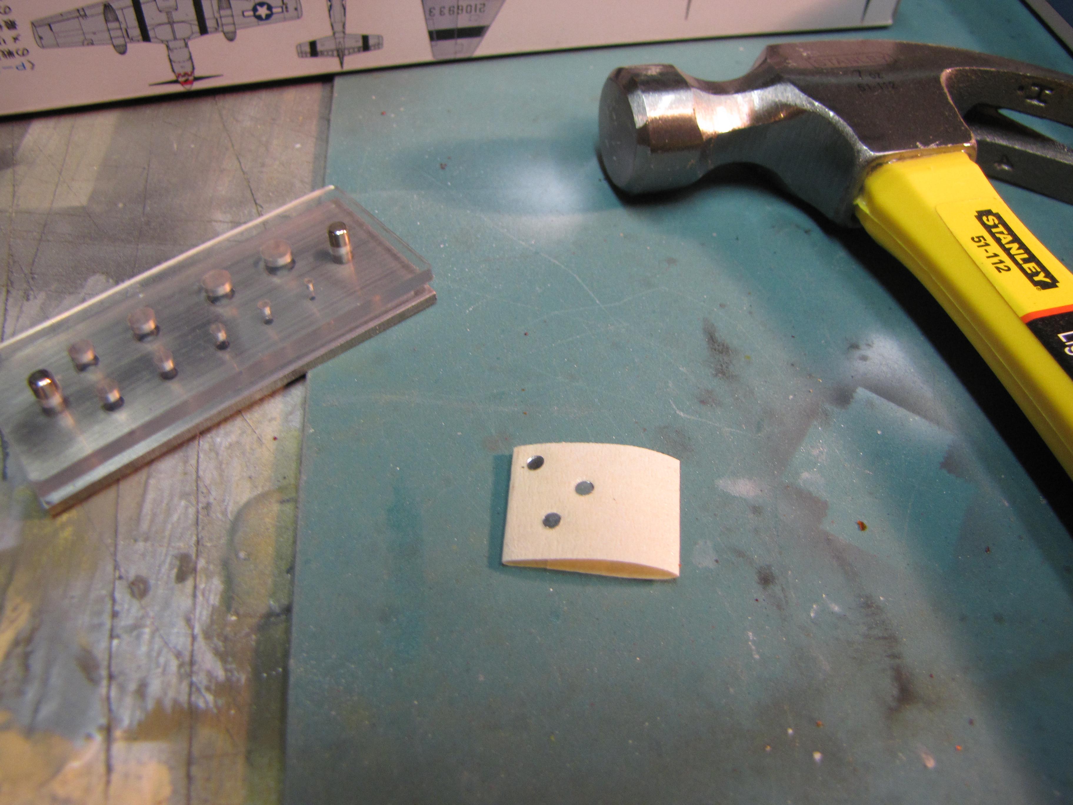 IMG_9339My actual last step is doing all the lights.  Most lights get a touch of bright Chrome Silver paint, followed by a clear version of whatever color they need to be.  The small, round identification lights that go under the starboard wing are punched from bare metal foil then painted.