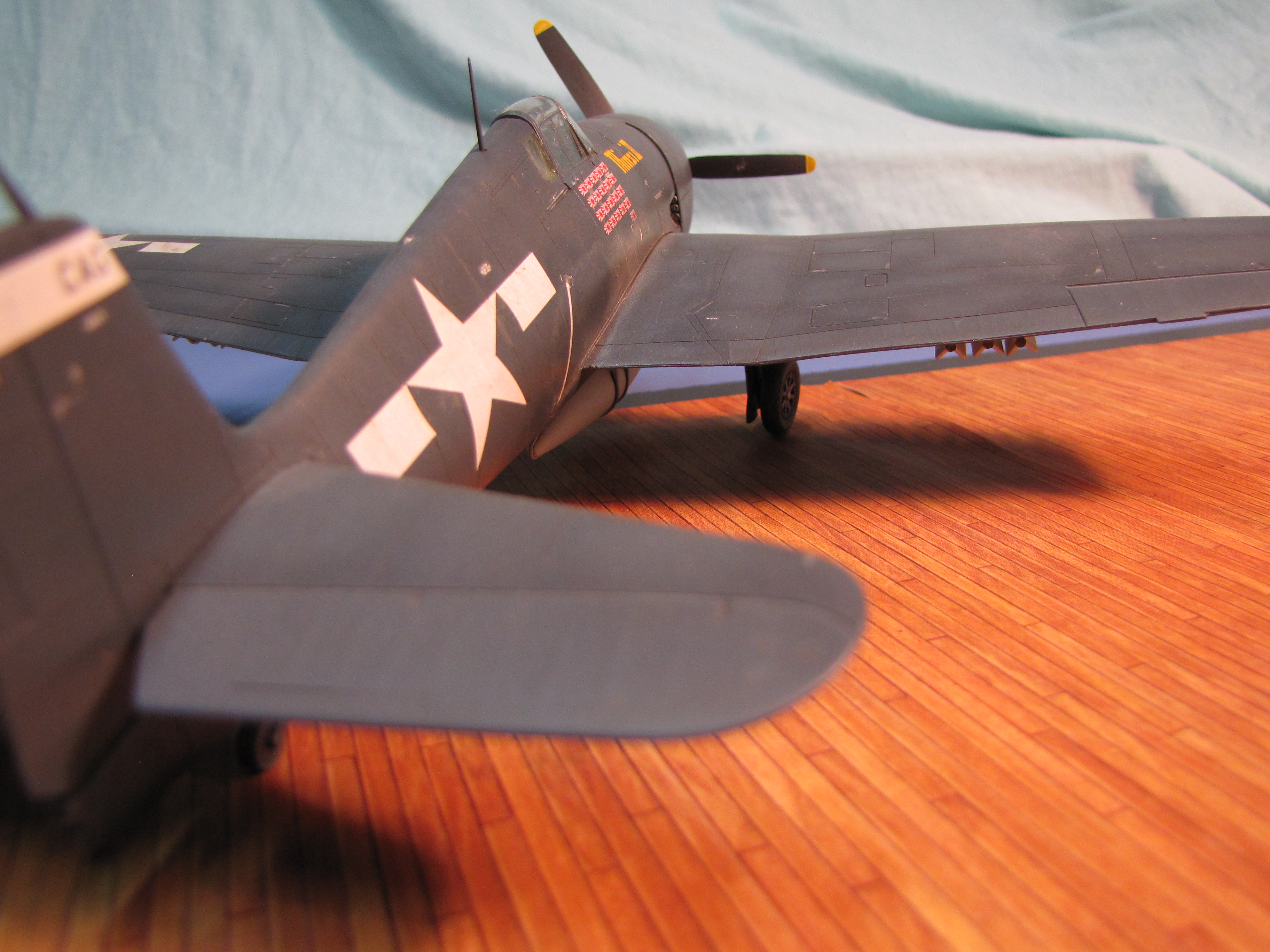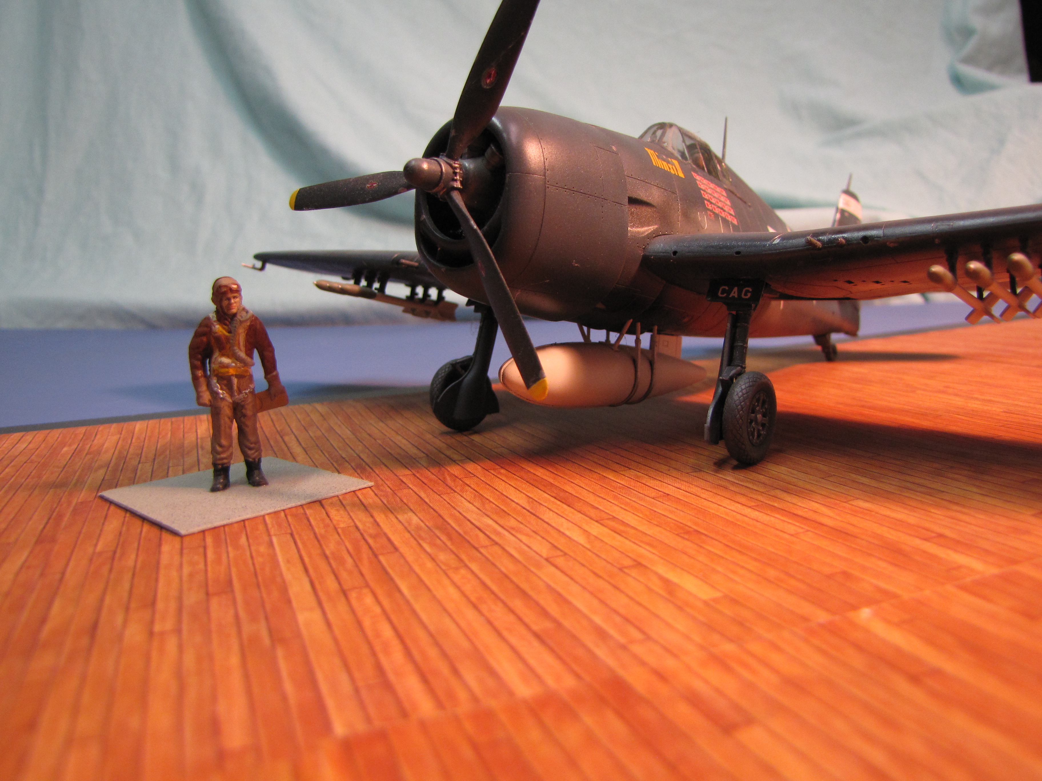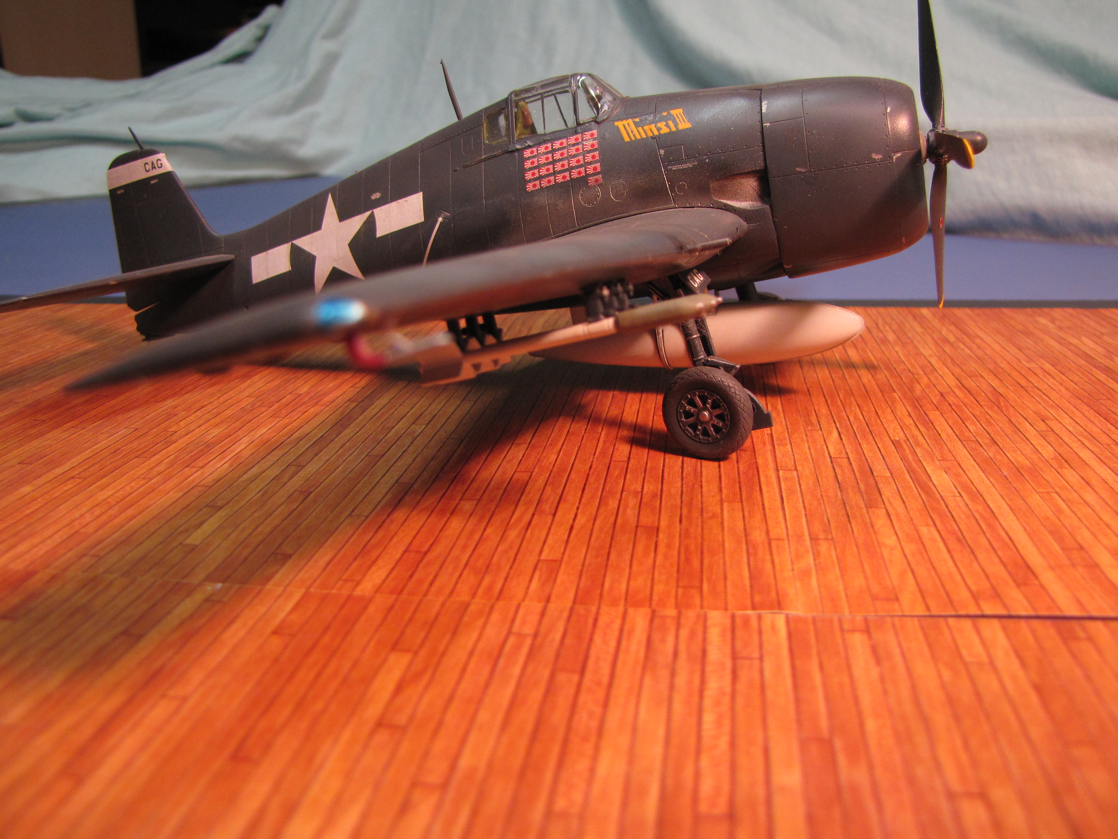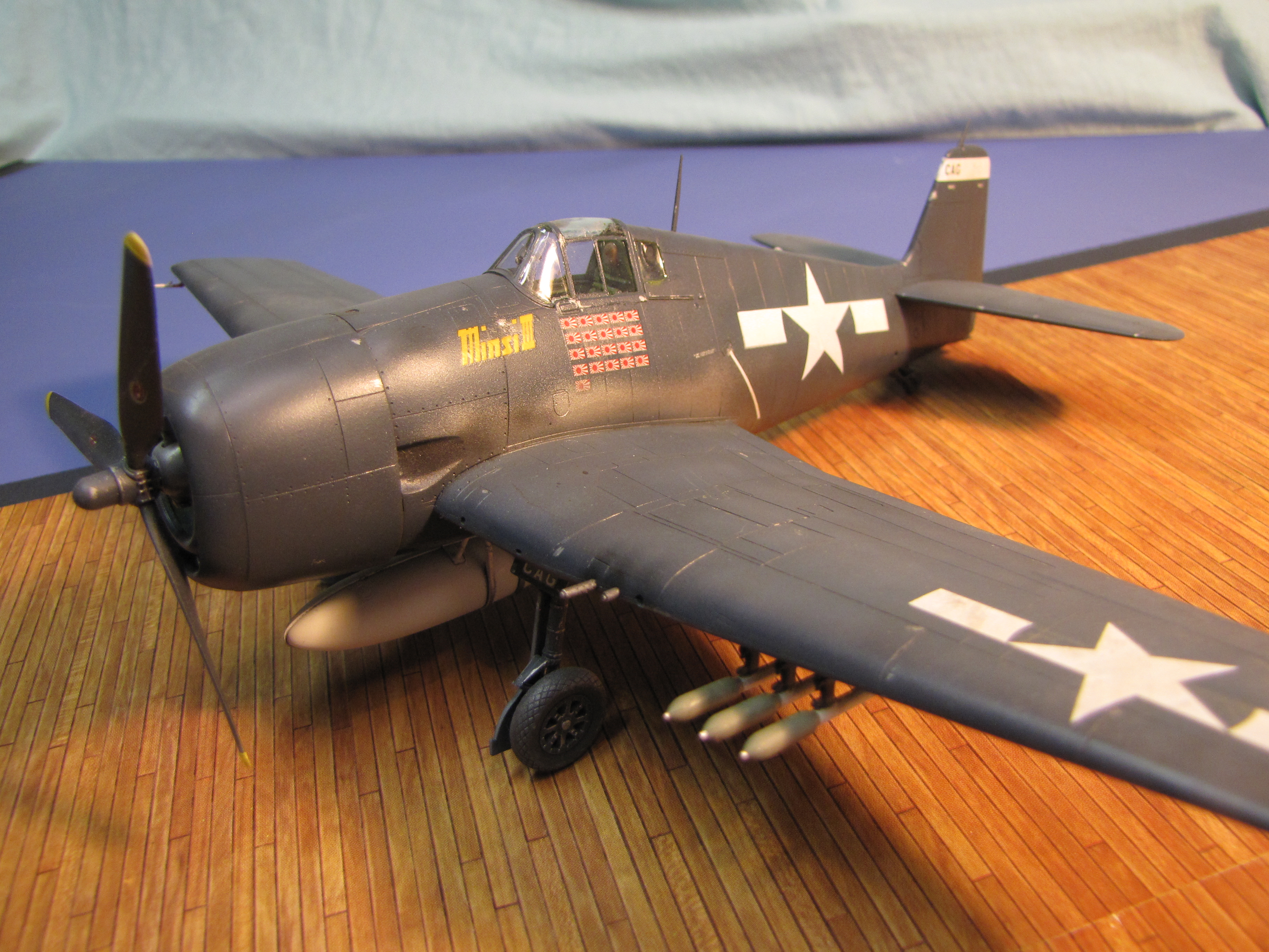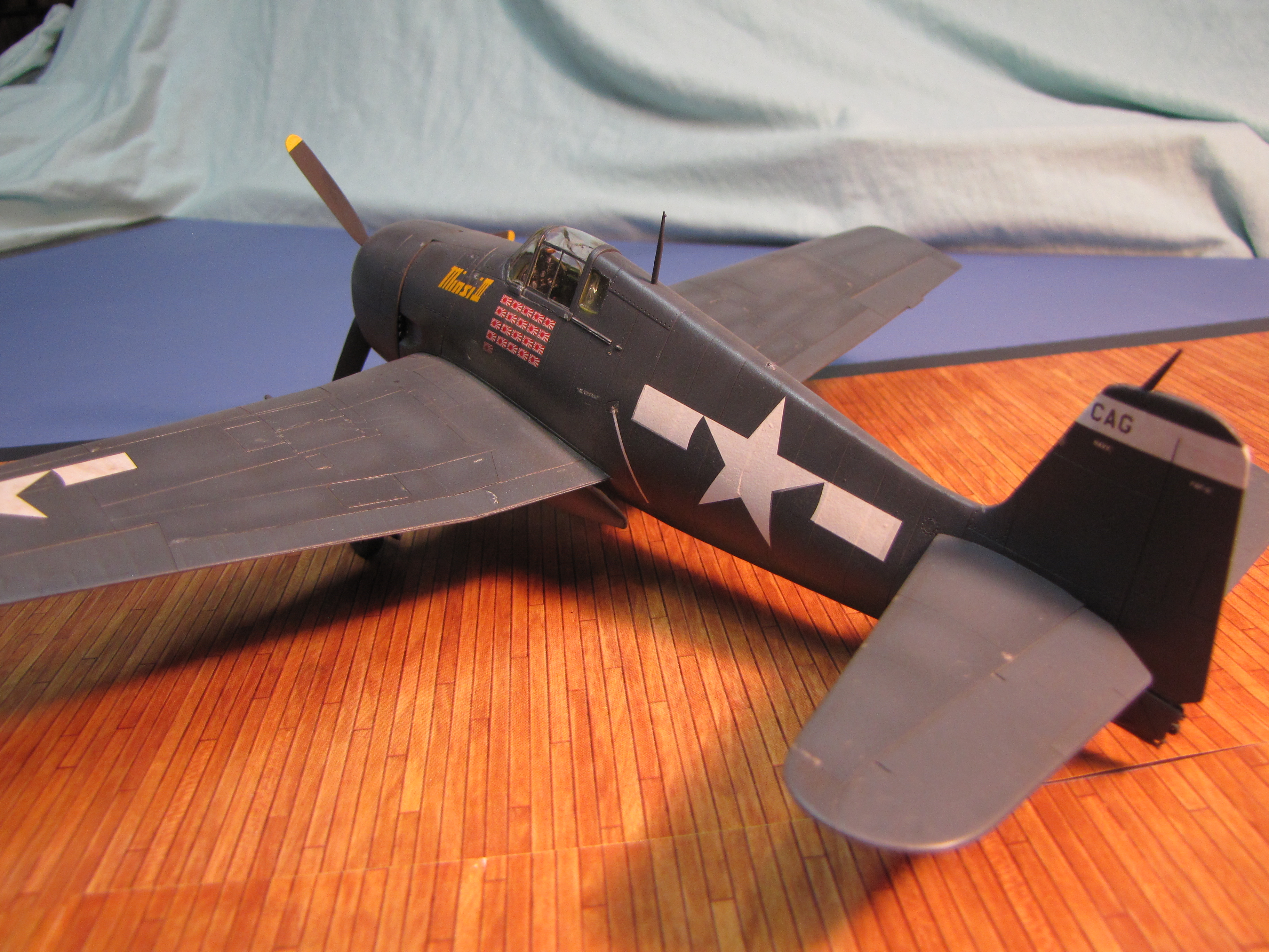 This is the Hasegawa kit of “Minsi III”.  This is the plane Cmdr McCampbell flew in the later part of his tour and in which he had his 9 kill mission.  There are few external clues to distinguish an F6F-5 from an F6F-3; the biggest differences were the addition of water-ethanol boost to the engine and spring tabs on the ailerons for improved maneuverability.  There were several other minor detail differences; but I find it amusing that the most significant change to the viewer is just the color.  The Navy coincidentally changed their camouflage order from a three tone scheme to over-all Navy Blue at the same time Grumman was switching from -3 to -5 production.  So the color of the paint is literally the first indicator of what version Hellcat we’re looking at.