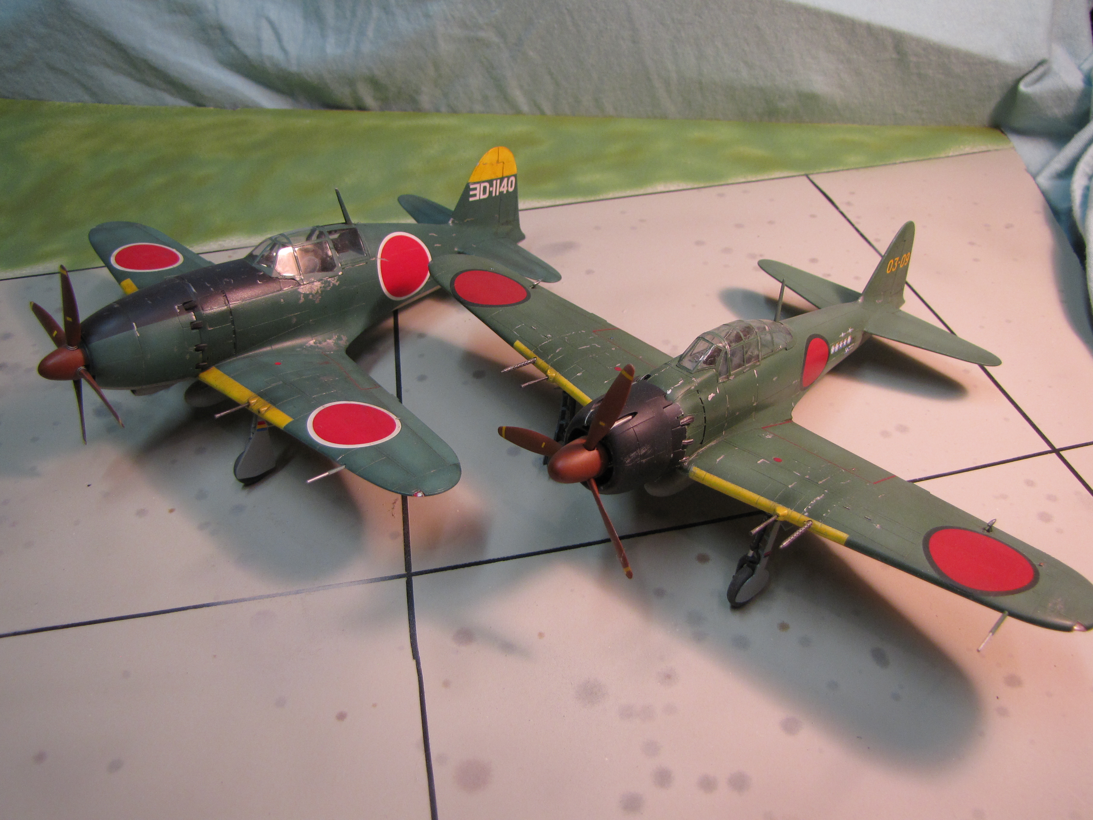 Mitsubishi fighters.  Here the Jack is shown with a late-war Zero, both aircraft served in homeland defense.