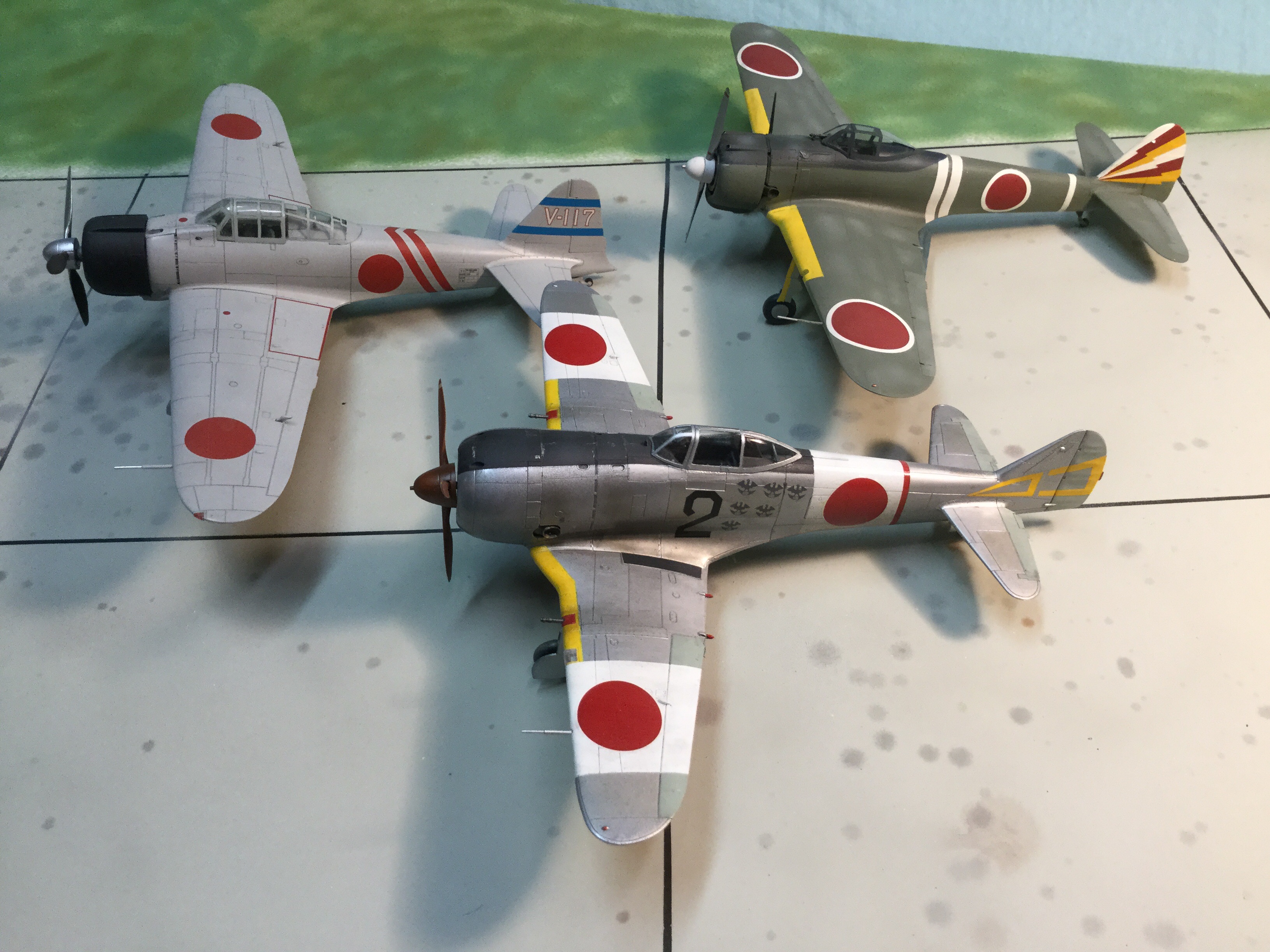 Three “Modern” Japanese types at the start of WWII. Allied pilots typically called all three “Zero”, even though only the grey one here is actually a Navy Type 0.