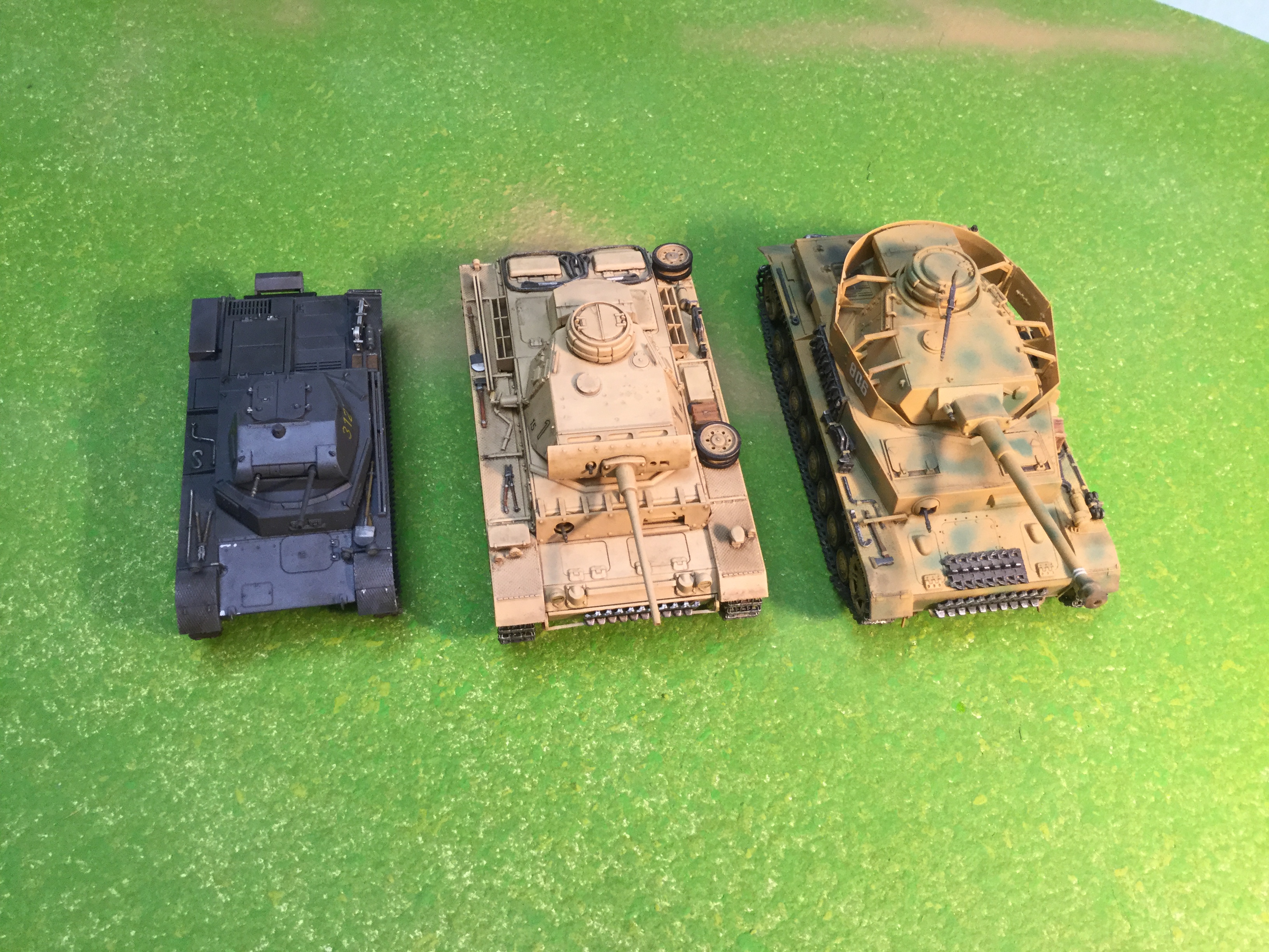 The whole range of German made tanks in World War II, counter clockwise from Panzer II (the smallest) to Panzer III, Panzer IV, Panzer V (Panther), Panzer VI (Tiger), Panzer VIB (King Tiger). The growth in size is breathtaking.
