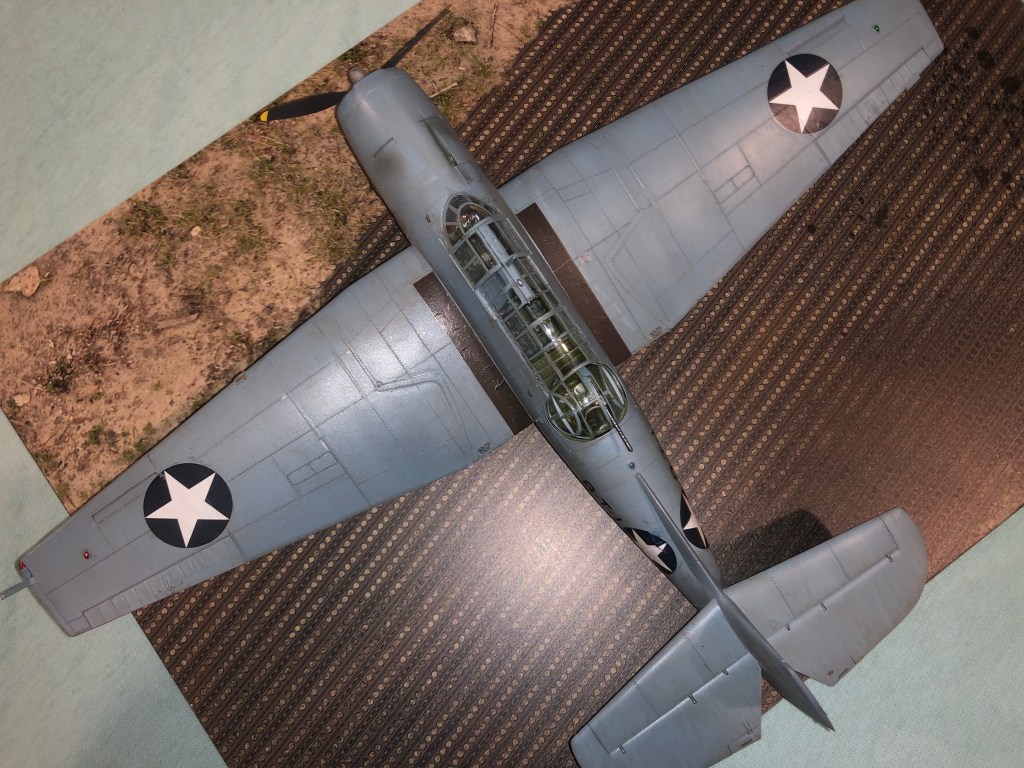 This is the TBF-1 flown by Ensign Earnest that day, it is the Accurate Miniatures kit with Yellowhammer Decals. Accurate Miniatures only did the TBF-1c and TBM-3, so I used a conversion set by KMC to backdate the TBF-1c to a TBF-1. There were a few changes to fuselage windows, but the most obvious difference is the forward armament. Starting with the TBF-1c all Avengers had a .50 in each wing, this was mainly meant for clearing the path ahead on a torpedo run. The two .50s would at least force enemy gunners ahead of them to take cover. It was also useful for close support work, and those rare occasions when an Avenger caught an enemy search plane or bomber. This firepower came about specifically because the single .30 in the nose of the TBF-1, as seen here, was found to be woefully inadequate for the job. Apart from some electronic and instrumentation upgrades, this change in firepower would be the most significant in the whole run of Avenger production. So removing the wing mounted guns, and substituting a new right cowling piece is the most obvious part of the conversion.