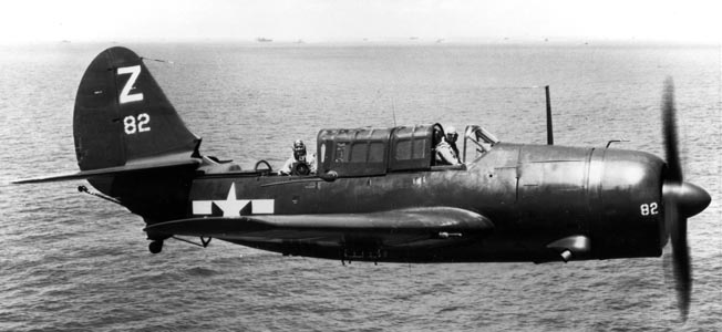 The invasion of Okinawa came on April 1. Bombing squadrons had just been reduced to 15 aircraft (I believe from 18, but in 1942 there were 36 dive bombers on a fleet carrier) in an effort to increase fighter numbers against the Kamikaze. The Helldivers were much appreciated by the ground forces for their ability to hit precise targets.