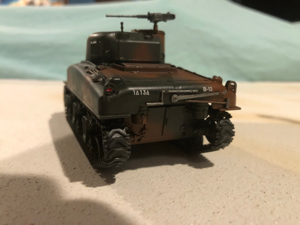 The subject here is an early M4A1 with the 1st Armored Division in Italy, Summer 1944. The 1st Armored Division was, appropriately, the first US Armored Division to see combat in World War II. They came ashore in North Africa as part of Operation Torch on November 8, 1942. They were a part of the US Army’s brutally tough learning curve against the Wehrmacht in the next couple months and continued to the end of that campaign in May 1943. They spent a couple months out for re-equipping and reorganization, then entered combat in Italy November 1943. The 1st Armored was landed at Anzio in January and was a part of the breakout that took Rome in June. They remained fighting in Italy to the end of the War.