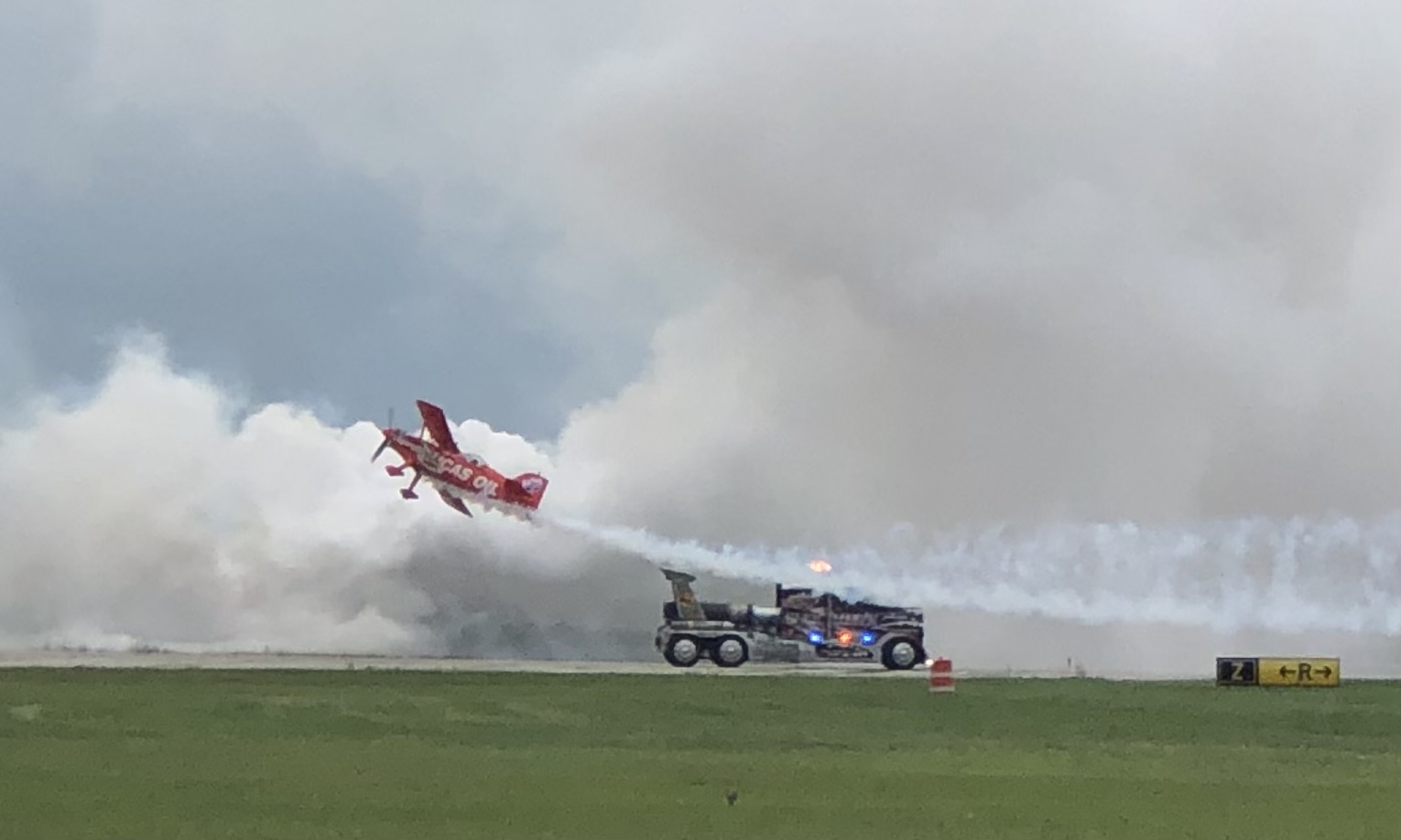 Interesting face off. That’s “Shockwave”, the three jet powered semi-tractor against a Pitts. They had a fair and sporting drag race in the true WWE sense of the word…