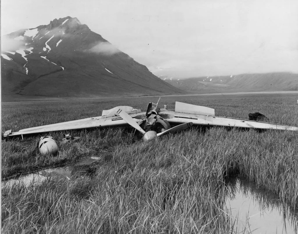 Over a month later, on July 10, 1942, a PBY flown by Lt William Thies and Ens Robert Larson was returning from an all night patrol. They had been blown off course overnight and found themselves in fog that morning. As conditions improved they got their bearings and they sighted land, and decided to keep the various islands in sight as they worked their way home. The last island they passed over before Amaknak was Akutan. One of the gunners spotted a plane upside down in the marsh. It was light grey with plainly visible meatballs on the wings. The location was noted and they returned to Dutch Harbor.