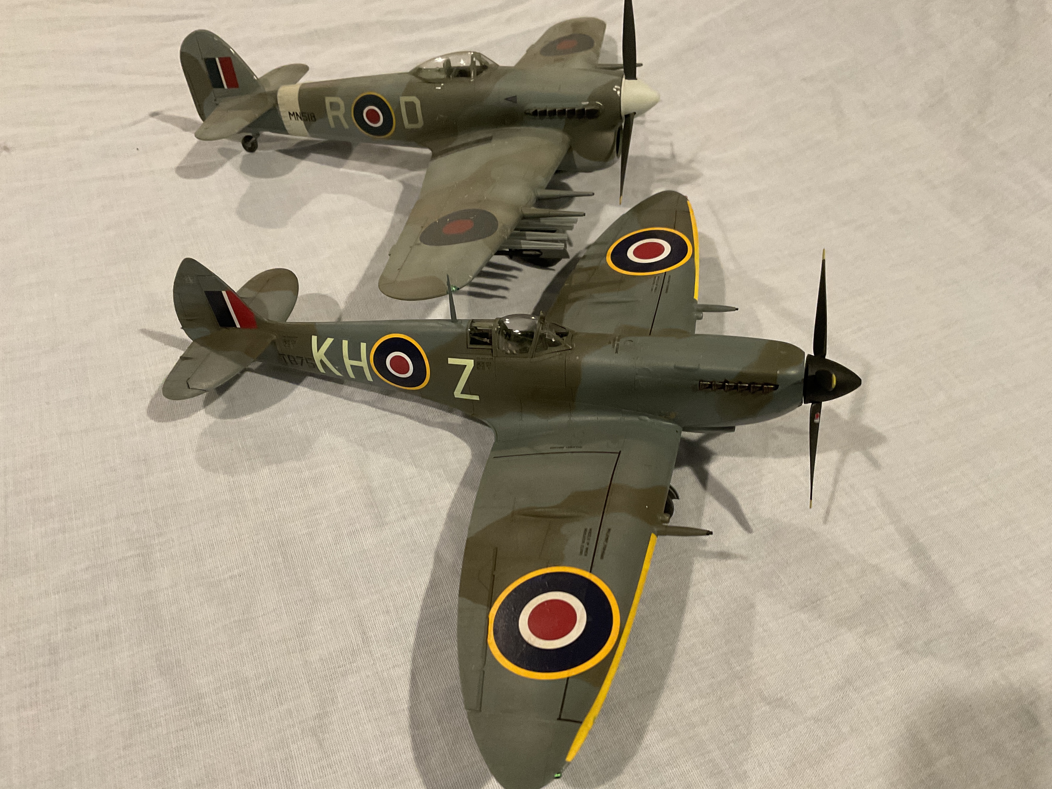 Late in the War, Mk IX and Mk XVI Spitfires were mostly assigned to the 2nd Tactical Air Force which provided close support for the fighting in Northern Europe. They often provided fighter cover for the heavier ground pounders (like Typhoon shown here) but were heavily oriented towards ground targets. Air Defense of Great Britain and dedicated fighter cover over Europe was mostly flown by Tempests and Griffon-engined Spitfires (Mk XIV).