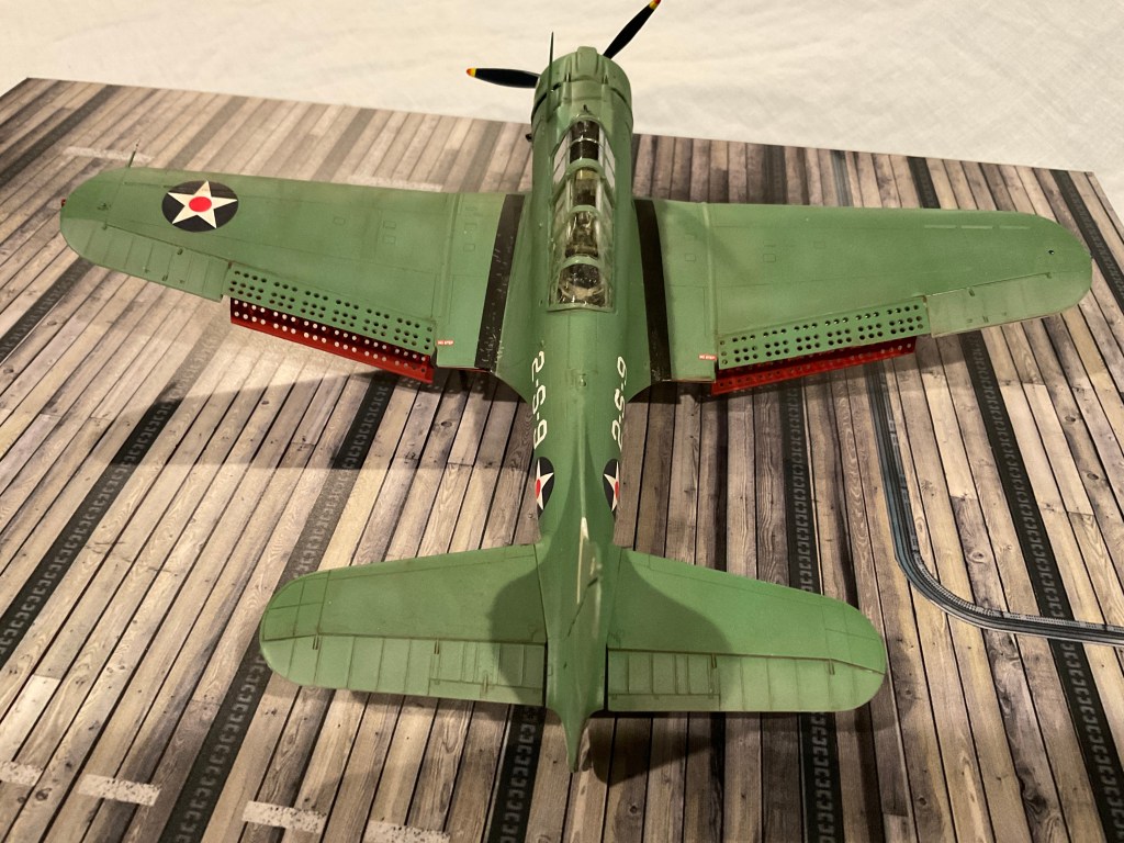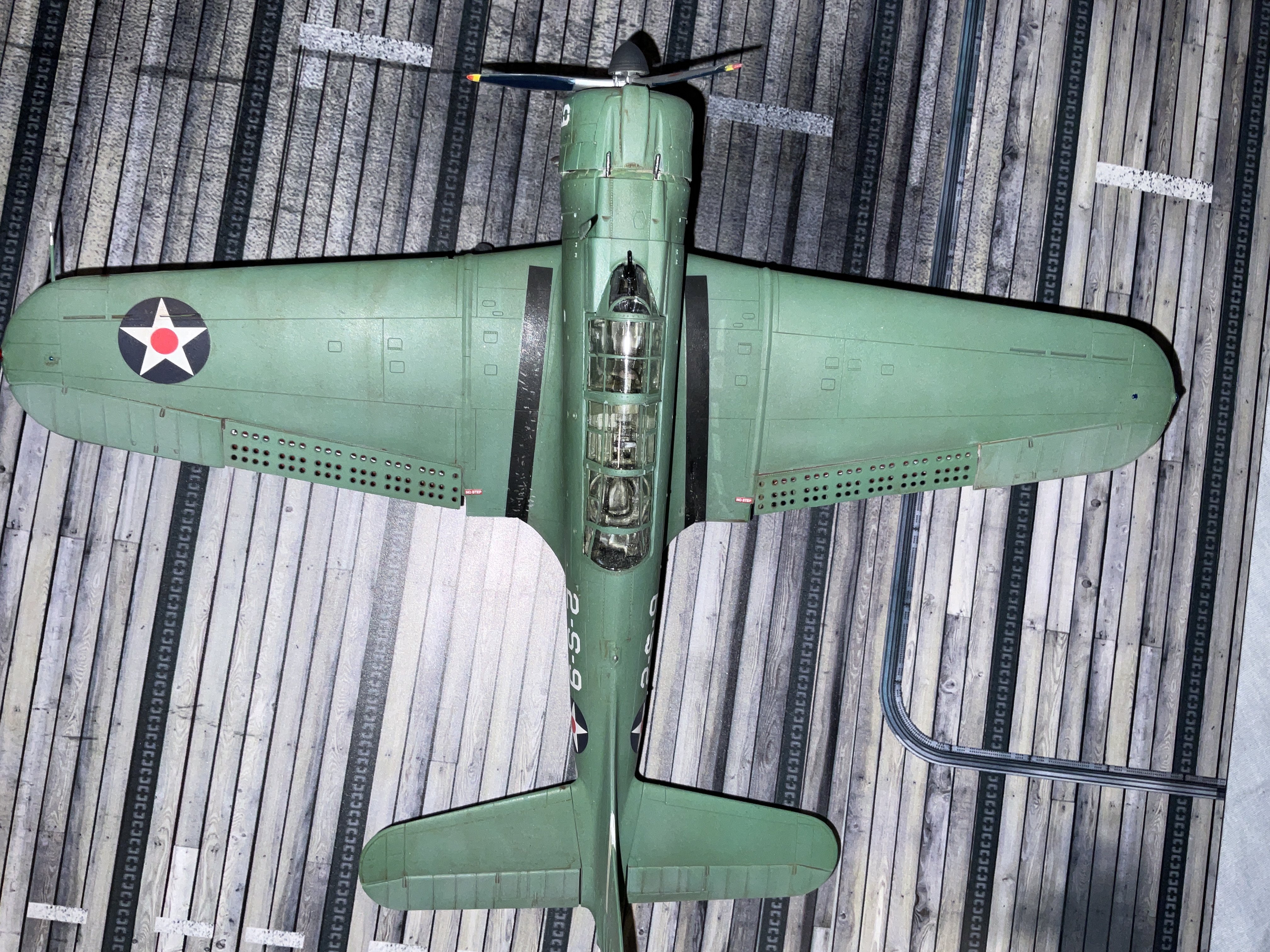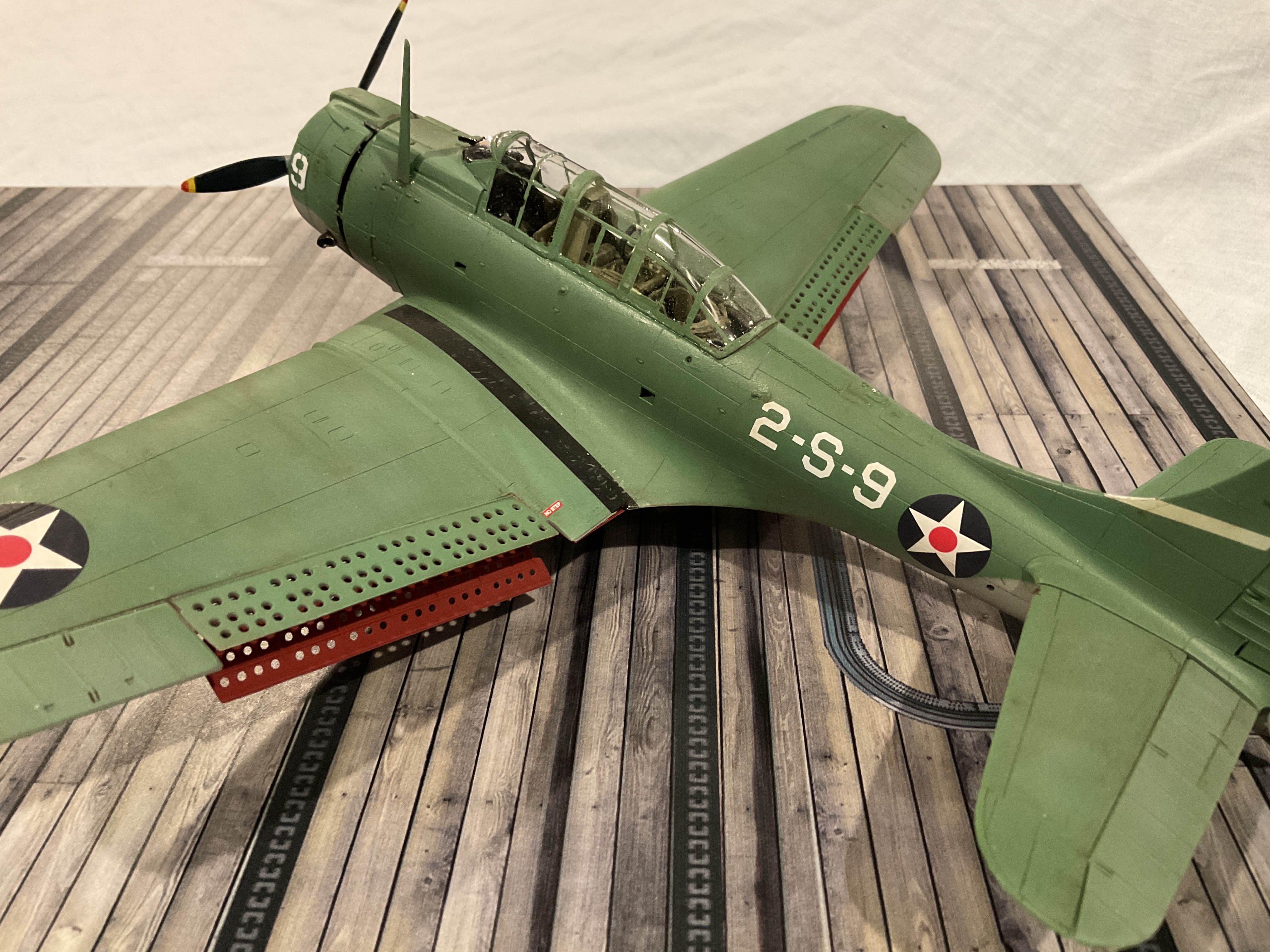The green SBD photographed by Peter Bowers in 1941. There should be a “White 9” on the forward cowling, I’m assuming it was added after this photo was taken! But notice the defensive gun is not mounted. Also visible under the wing is a practice bomb dispenser; which I didn’t have (!), so I mounted pre-War yellow Ordnance. Looks good with the Green…