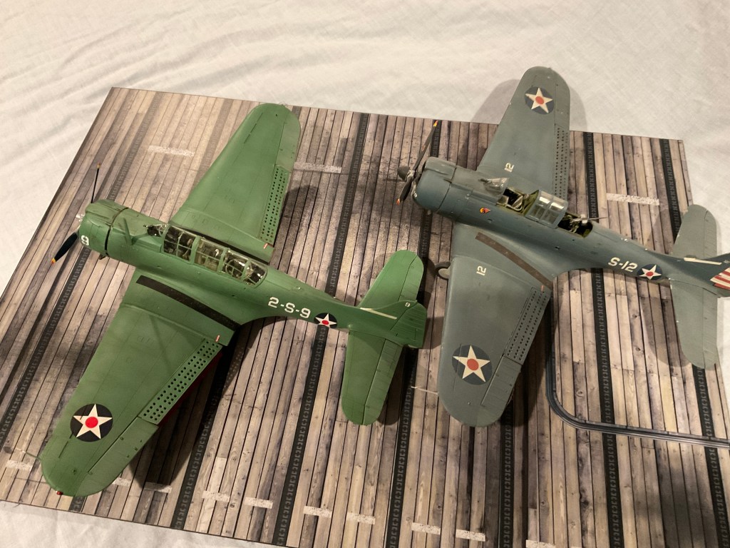 Many units took it upon themselves to experiment too. This involved mostly different blues, but several greens also were used. In particular, Scouting Two off the USS Lexington used a non-specular grey-green in September – October 1941 on at least one Dauntless that posed for pictures. Black and White pictures, but that is the inspiration for this build. This plane was not unique, several green machines in Navy use were seen along the West Coast during that year.