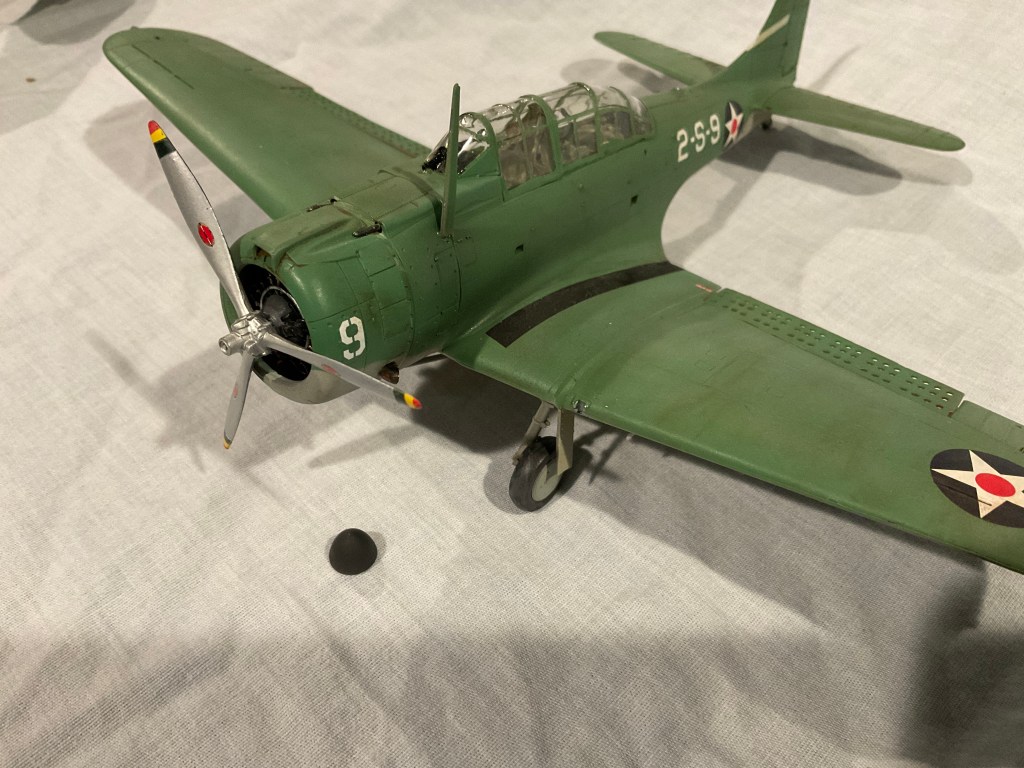 This aircraft would have been a new SBD-3 in late 1941 so I kept weathering to a minimum. Now I need to confess, this was sort of a “left overs” project. Enough that we might call it a “hypothetical”. The kit is the Accurate Miniatures Dauntless, but its an SBD-2 I had no particular plans for. The only visual “tell” I know of between the -2 and -3 would be the defensive machine gun switched from a magazine to belt-fed on the -3. So I left the gun out, as often it was during peace-time. But I noticed the sprues between the -2 and -3 kits were numbered differently, so I’m presumably missing something. I *think* some of the panel lines were cut differently around the nose. But honestly I don’t know.
