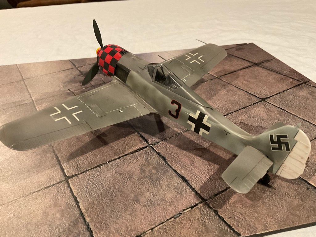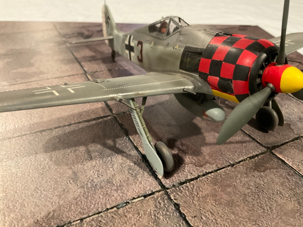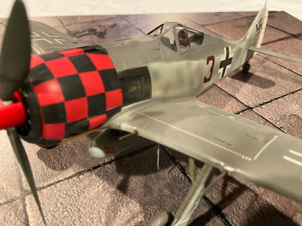 This particular aircraft was assigned to those defenders of northern Germany, JG 1. Apart from being at the peak of their effectiveness, 1943 also saw a peak for colorful markings. Briefly, the component Gruppen took to painting their noses solid white, yellow or red depending on which Gruppe. But soon, at least the Fw 190 equipped Gruppen adopted black checks over the color. Early in 1944 the switched to black stripes, so the red and black checks seen here identify this as a late 1943 aircraft.