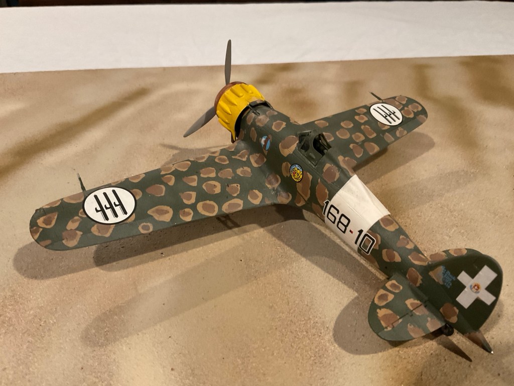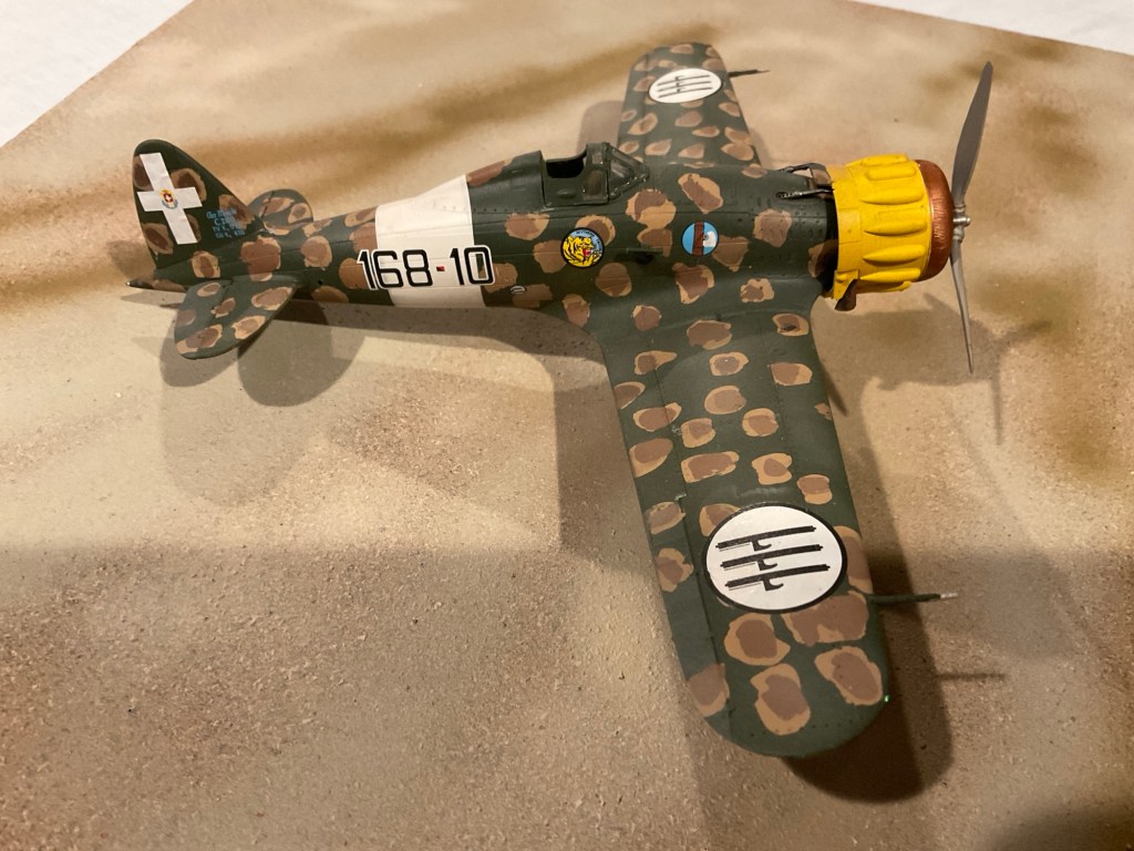 And indeed, the new aircraft was sturdy and showed great potential. It was somewhat handicapped on two points; first the Fiat A.74 engine was a bit behind World standard at the time, generating just under 900 horsepower with a top speed over 310 mph. But the plane was small and light which made up for some of that. Unfortunately one one of the “light” aspects was armament; only two heavy machine guns synchronized through the propeller (and thereby at reduced rate-of-fire). Compared to the new British fighters with 8 light machine guns this was very light. Some attempts at remedy for both shortcomings were made, we’ll get to those…