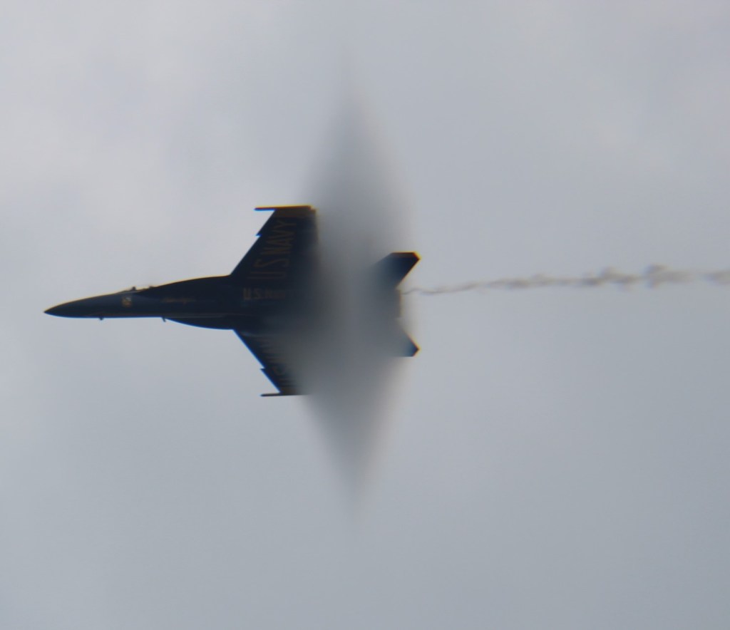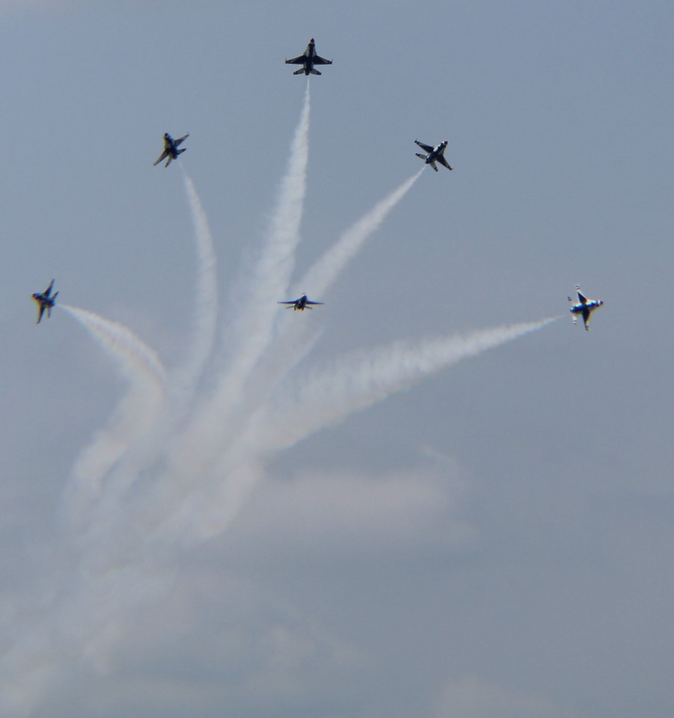 They mostly gave us a continuous stream of low passes for 15 minutes, but late in the program several of the planes formed up.Let’s just say my wife’s camera blows away anything I can do on the iPhone!Did I mention it was a humid day?I took my own F-18 up so I could get a good close-up… Sorry, day dream inspired by Jodie’s new camera…Okay, extra bonus treat. This was the first time ever in Michigan that Blue Angels and Thunderbirds were at the same airshow.Interesting that the two seaters seem to have extra fuel?The jet teams did their low shows because of a low cloud deck. Now doubt the Thunderbirds’ vertical burst is amazing to see; but the flat burst pointing strait at the viewers is hardly less!